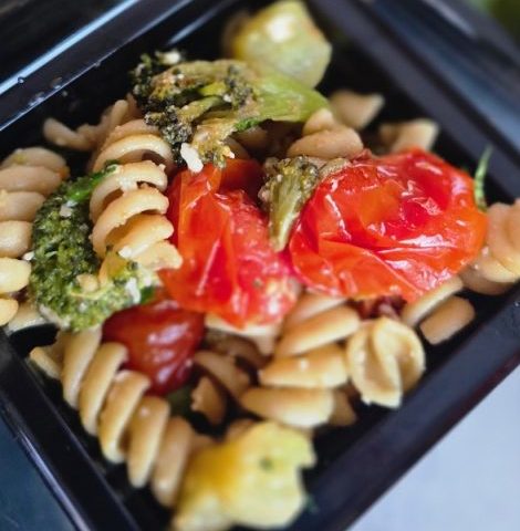 Roasted broccoli and tomatoes highlight this rotini pasta salad, tossed with a garlic lemon dressing. This salad is garnished with fresh cilantro and Parmesan cheese and served chilled.